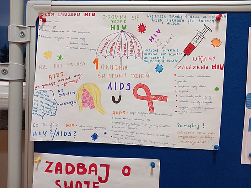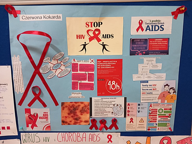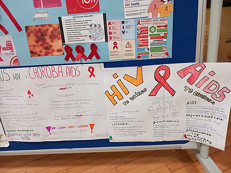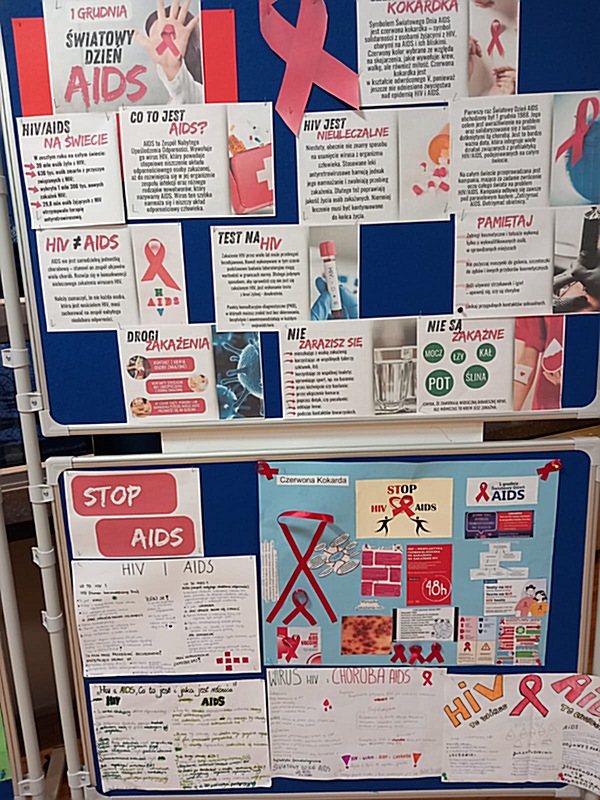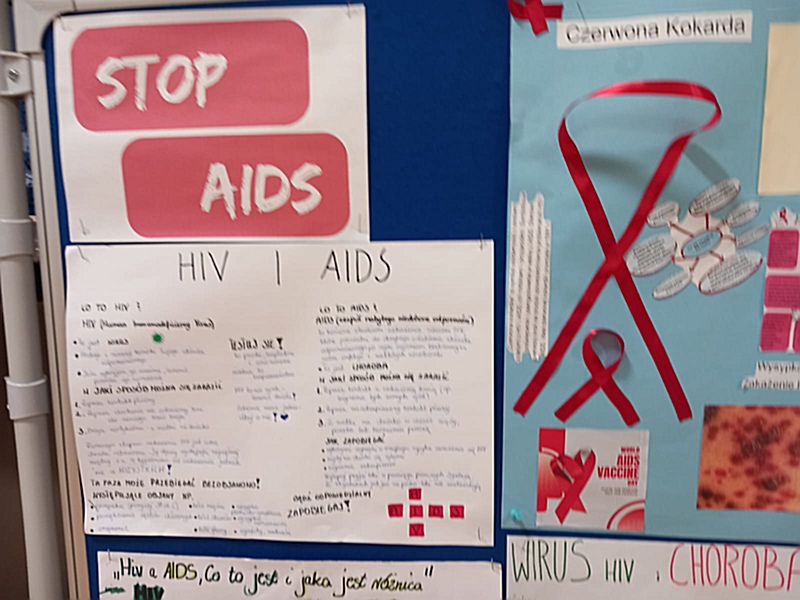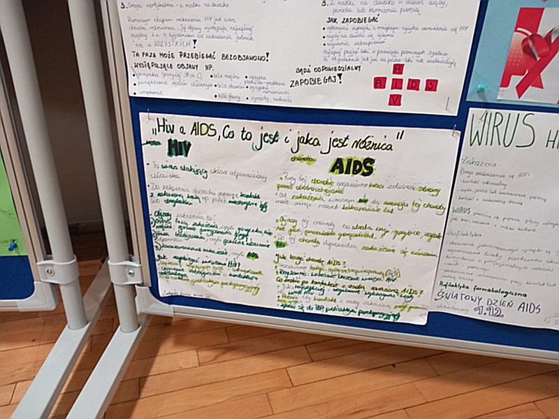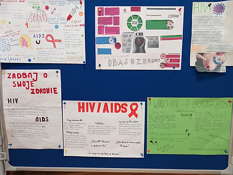 Przez cały tydzień na lekcjach biologii klasy 7 i 8 realizowały działania z zakresu „Krajowego Programu Zapobiegania Zakażeniom HIV i Zwalczania AIDS". Podczas zajęć uczniowie uczestniczyli w pogadankach, w czasie których nauczyli się odróżniać pojęcie HIV i AIDS, poznali drogi zakażenia wirusem HIV, rozpoznawali sytuacje, które nie niosą ryzyka zakażenia, a także uświadomili sobie potrzebę tolerancji i wsparcia dla osób zakażonych HIV oraz chorych na AIDS. Po części teoretycznej uczniowie sprawdzili poziom przyswojenia wiadomości rozwiązując krzyżówkę dotyczącą omawianych zagadnień. Chętni uczniowie wykonali także plakaty profilaktyczno-informacyjne „Co wiem o HIV/ AIDS!”