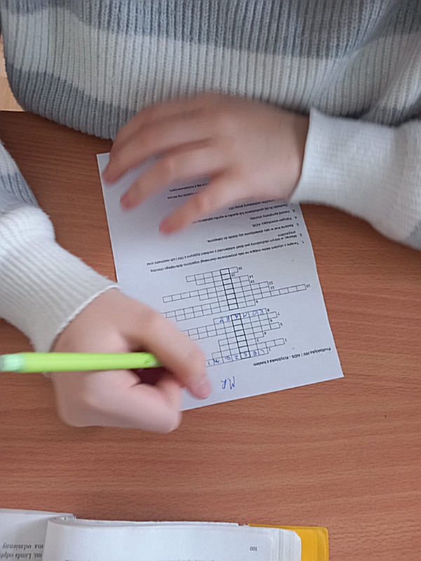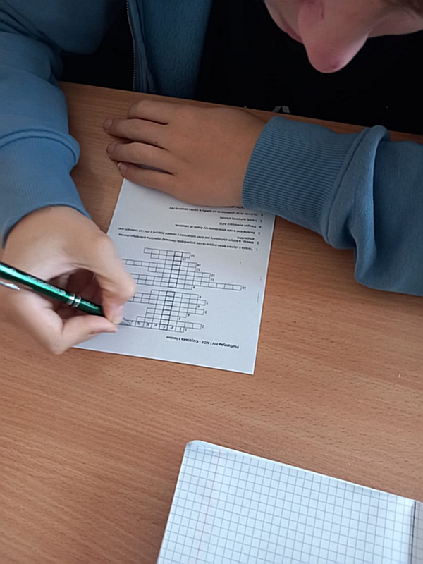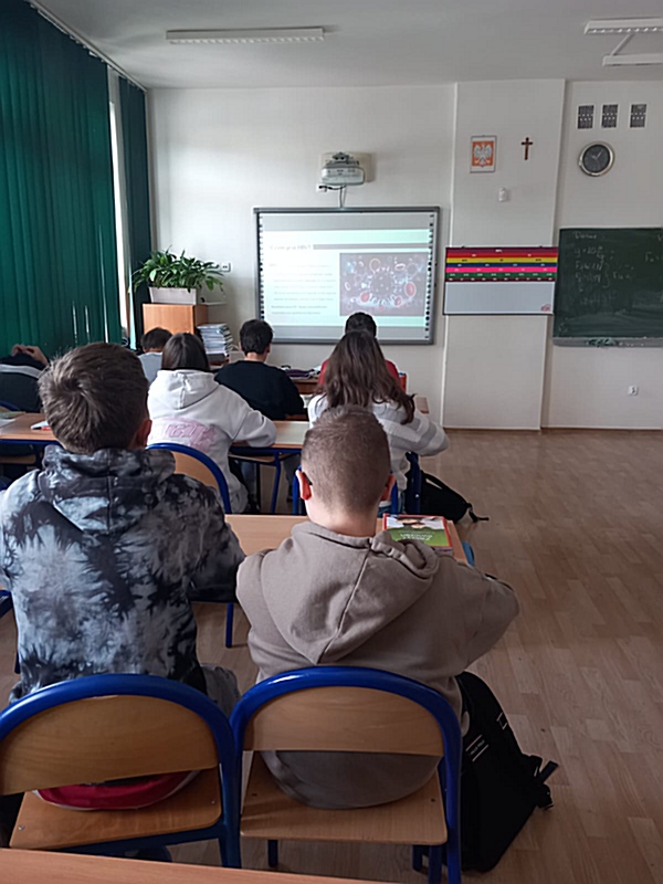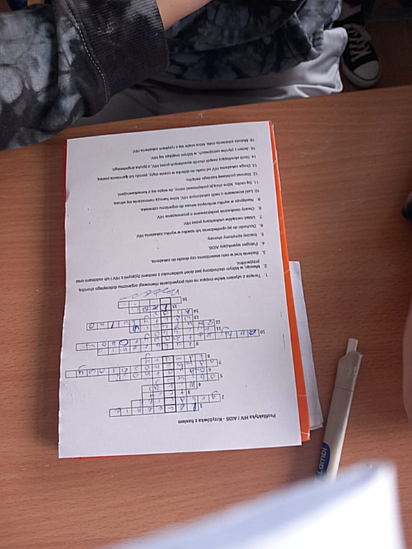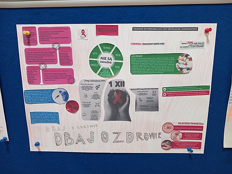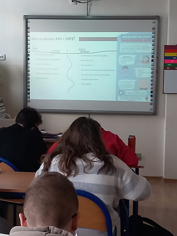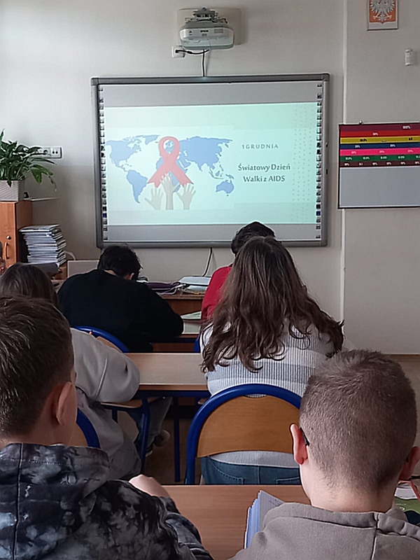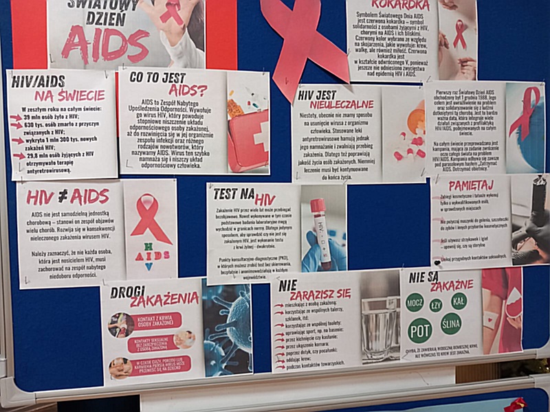 Przez cały tydzień na lekcjach biologii klasy 7 i 8 realizowały działania z zakresu „Krajowego Programu Zapobiegania Zakażeniom HIV i Zwalczania AIDS". Podczas zajęć uczniowie uczestniczyli w pogadankach, w czasie których nauczyli się odróżniać pojęcie HIV i AIDS, poznali drogi zakażenia wirusem HIV, rozpoznawali sytuacje, które nie niosą ryzyka zakażenia, a także uświadomili sobie potrzebę tolerancji i wsparcia dla osób zakażonych HIV oraz chorych na AIDS. Po części teoretycznej uczniowie sprawdzili poziom przyswojenia wiadomości rozwiązując krzyżówkę dotyczącą omawianych zagadnień. Chętni uczniowie wykonali także plakaty profilaktyczno-informacyjne „Co wiem o HIV/ AIDS!”