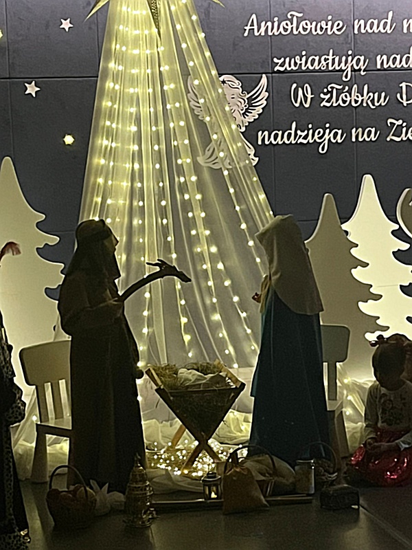 Mali artyści z ogromnym zaangażowaniem i przejęciem wcielili się w swoje role, tworząc wzruszającą opowieść o narodzinach Jezusa. Piękne stroje, nastrojowa muzyka oraz dziecięca szczerość sprawiły, że na sali zapanowała wyjątkowa, świąteczna atmosfera pełna ciepła i radości.