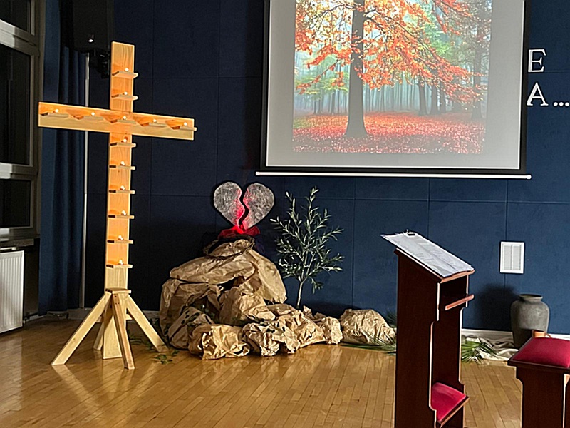 Dekoracja w symboliczny sposób prowadziła nas przez najważniejsze wydarzenia z życia Pana Jezusa – od pierwszego cudu w Kanie Galilejskiej, poprzez uroczysty wjazd do Jerozolimy, witany gałązkami palmowymi, modlitwę w Ogrójcu, cierniem ukoronowanie, aż po Golgotę i krzyż. Całość dopełniało wymowne, rozdarte ludzkie serce z kamienia, które Pan Jezus uzdrawia swoim zmartwychwstaniem, niosąc nadzieję i odkupienie.
