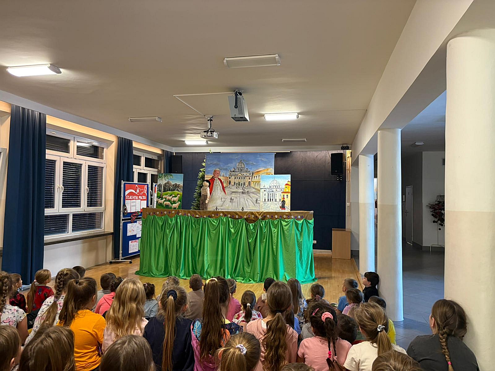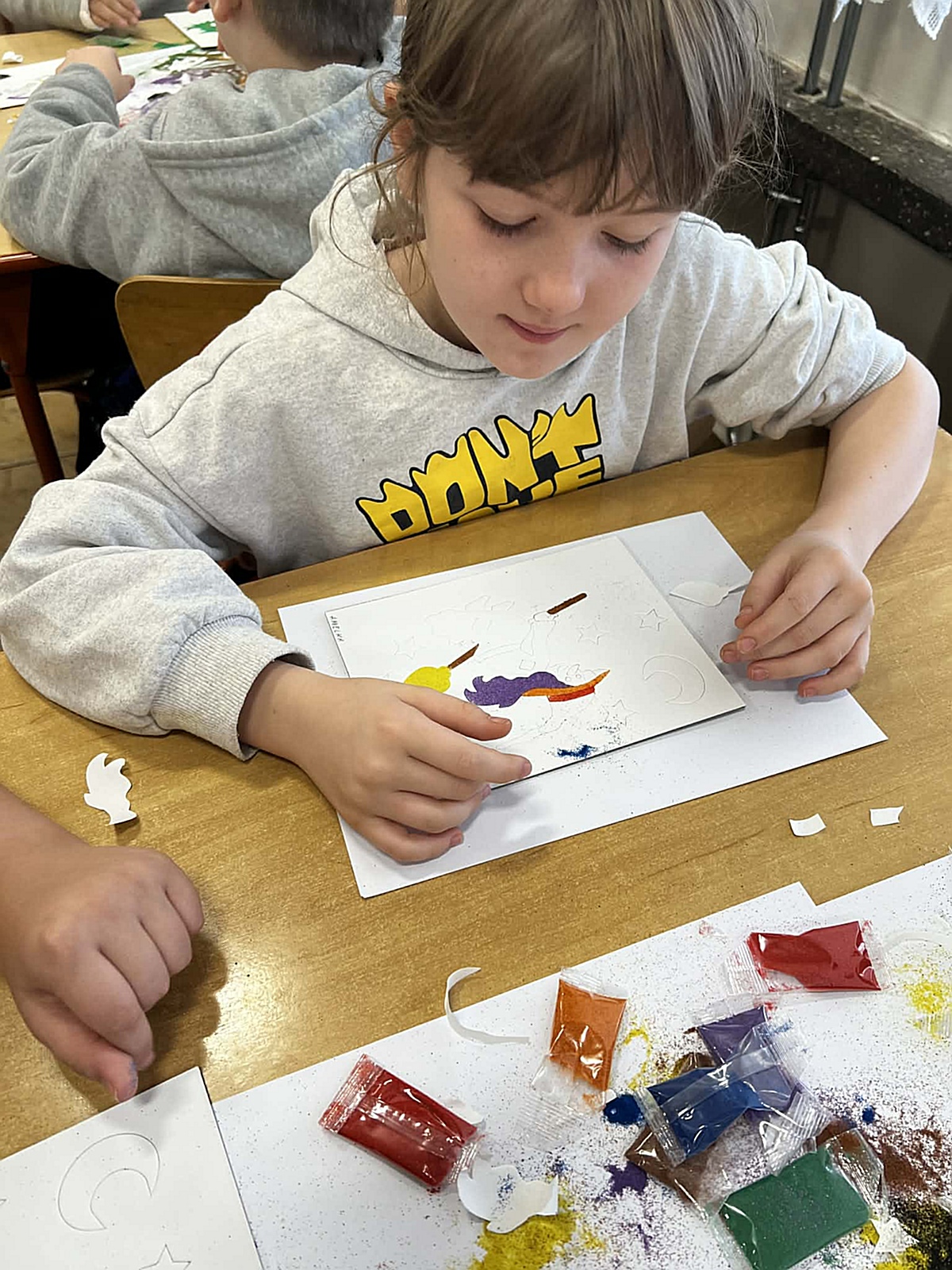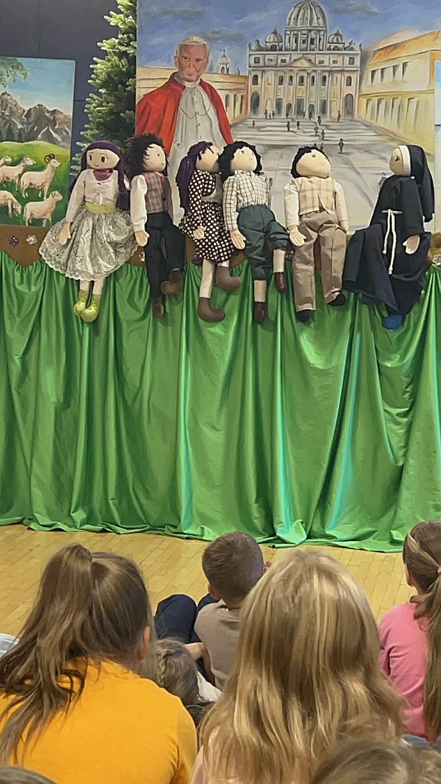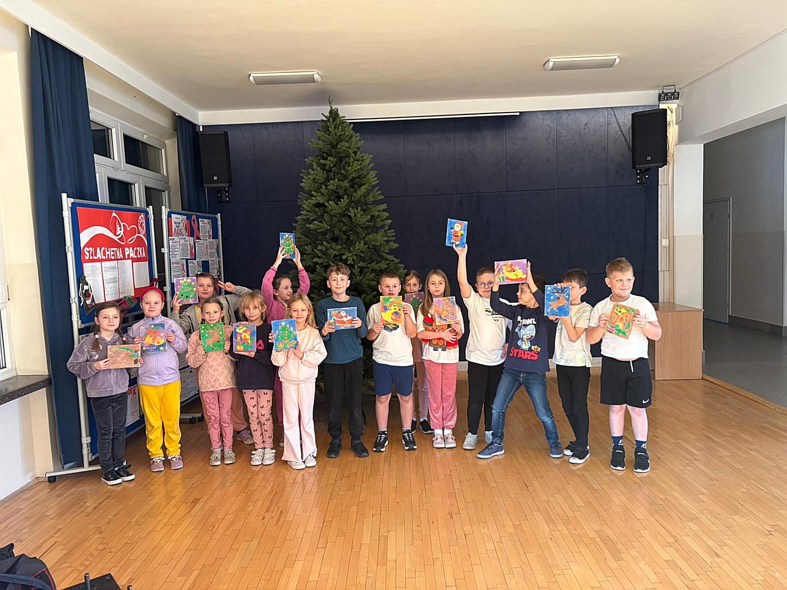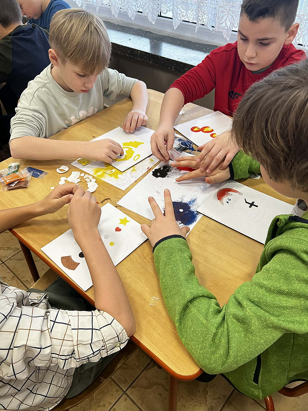 We wtorek, 02.12.2025 roku, uczniowie klas I-III wraz z wychowawcami wzięli udział w warsztatach plastycznych “Malowanie piaskiem”. Dzieci pod okiem instruktorki nauczyły się nowej dla nich techniki plastycznej polegającej na wypełnianiu konturów obrazka kolorowymi piaskami. Praca przyniosła uczniom wiele satysfakcji a jej efekty były bardzo zadowalające. Powstały piękne obrazki o tematyce świątecznej. Kolejnym punktem dnia był udział tej samej grupy w przedstawieniu teatrzyku kukiełkowego. Uczniowie mieli okazję zobaczyć spektakl oparty o książkę Joanny Krzyżanek “Jak Karolek został Papieżem”. Dzieci z wielką uwagą śledziły losy Karola od czasów jego dzieciństwa w Wadowicach, poprzez lata młodości i dojrzałości, aż do wyboru Polaka na najwyższy urząd w Stolicy Apostolskiej. Przedstawienie podobało się dzieciom i przybliżyło im postać późniejszego papieża.