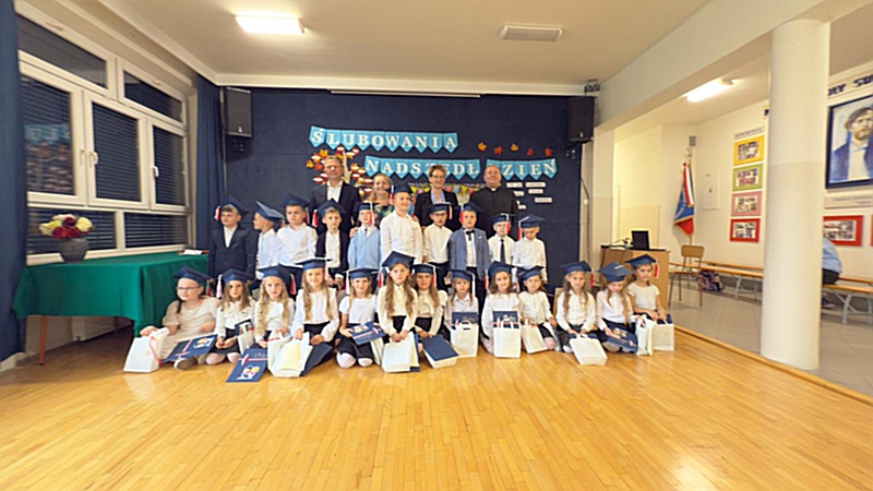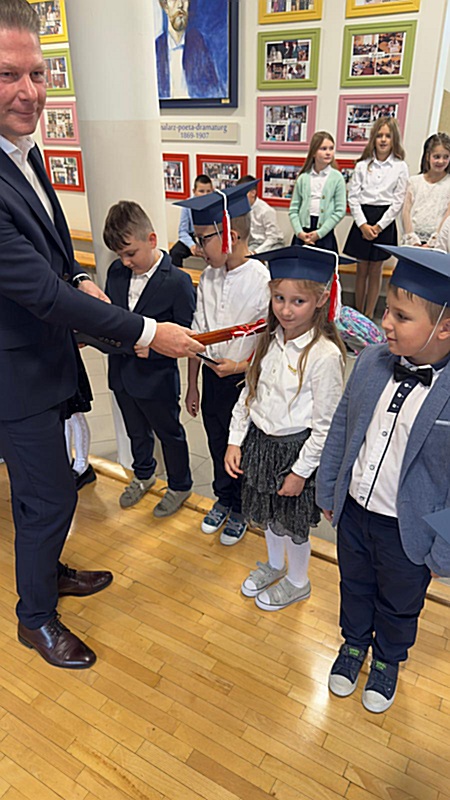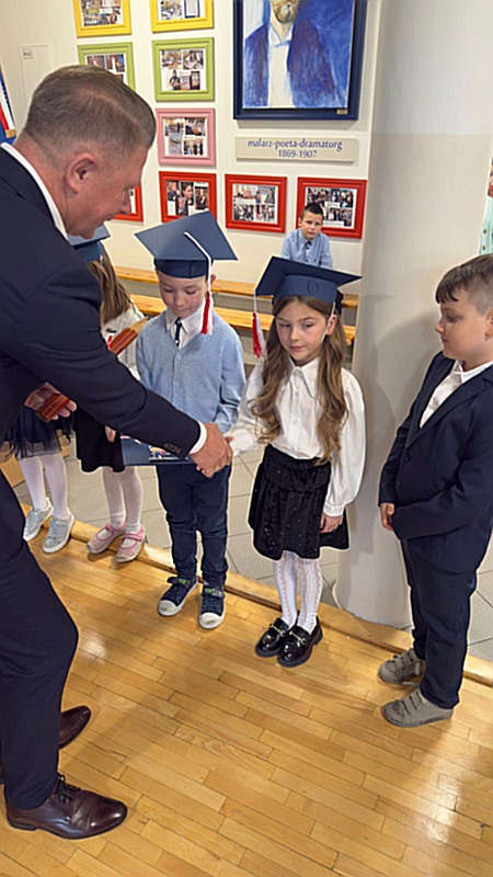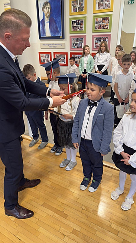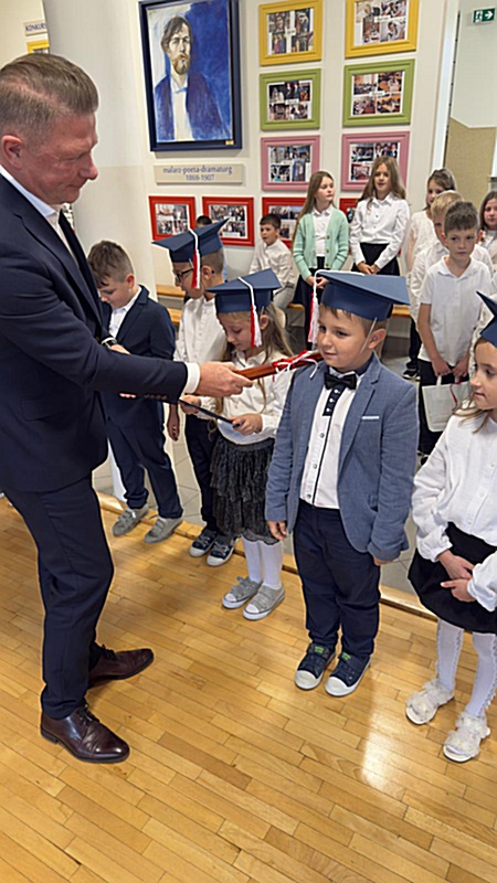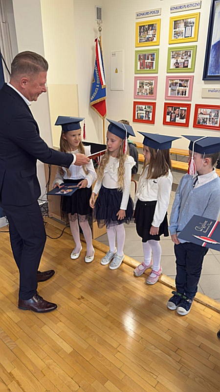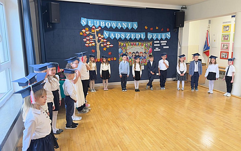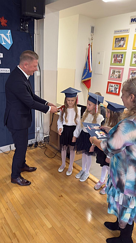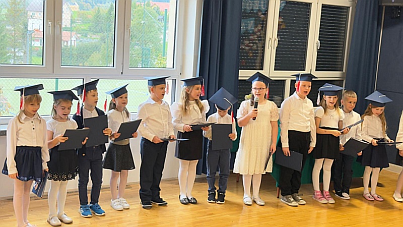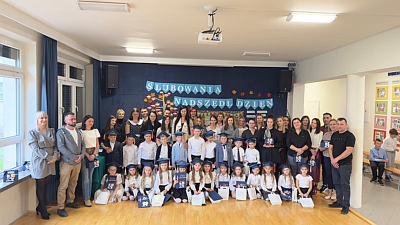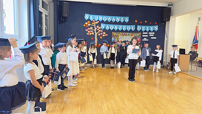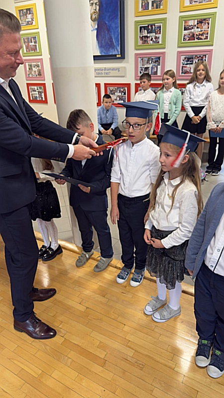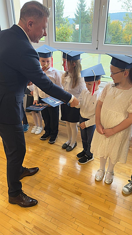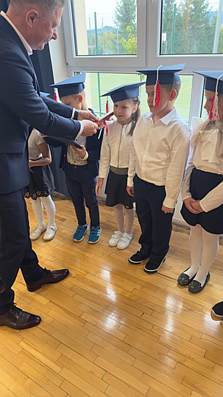 Dnia 17 października 2025r. do grona naszych uczniów oficjalnie zostali przyjęci kolejni pierwszoklasiści. Uczniowie klasy pierwszej przygotowywali się do tej uroczystości od początku roku szkolnego. Dzielnie uczyli się piosenek, wytrwale ćwiczyli recytację. W tym ważnym dniu, od samego rana panowała świąteczna atmosfera. Pierwszacy ubrani w strój galowy, piękna dekoracja sali, przygotowany sprzęt nagłaśniający i nagrywający to wszystko po to, by ślubowanie pierwszaków wypadło jak najbardziej uroczyście. Z pomocą uczniów klasy czwartej dzieci zaprezentowały swoje umiejętności. Po przez recytowanie wierszy, śpiewanie piosenek odgrywanie scenek udowodniły, że są gotowe do sumiennej pracy w szkole. W podniosłej atmosferze, w obecności Wójta Gminy Limanowa Jana Skrzekuta, Dyrektor Gminnego Zespołu Obsługi Szkół Edyty Król, Dyrektora Szkoły Roberta Piwowarczyka i Wicedyrektor Beaty Ryś, rodziców i nauczycieli, przed pocztem sztandarowym pierwszacy ślubowali być dobrymi Polakami, godnie reprezentować szkołę, swym zachowaniem i nauką sprawiać radość rodzicom i nauczycielom. Po złożeniu ślubowania pan dyrektor Robert Piwowarczyk dokonał symbolicznego pasowania, dotykając ołówkiem ramion swoich podopiecznych, wręczając im pamiątkowe dyplomy i legitymacje szkolne. Następnie koleżanki i koledzy z klasy drugiej życzyli pierwszakom sukcesów w nauce, zapewnili o pomocy i opiece starszych kolegów. Naszym najmłodszym uczniom życzymy samych sukcesów i radości ze zdobywanej wiedzy.