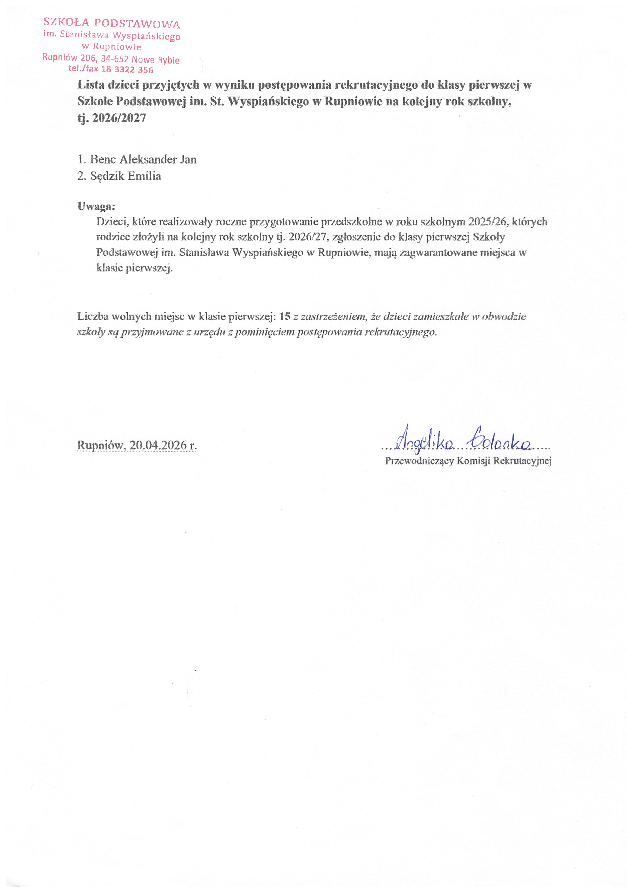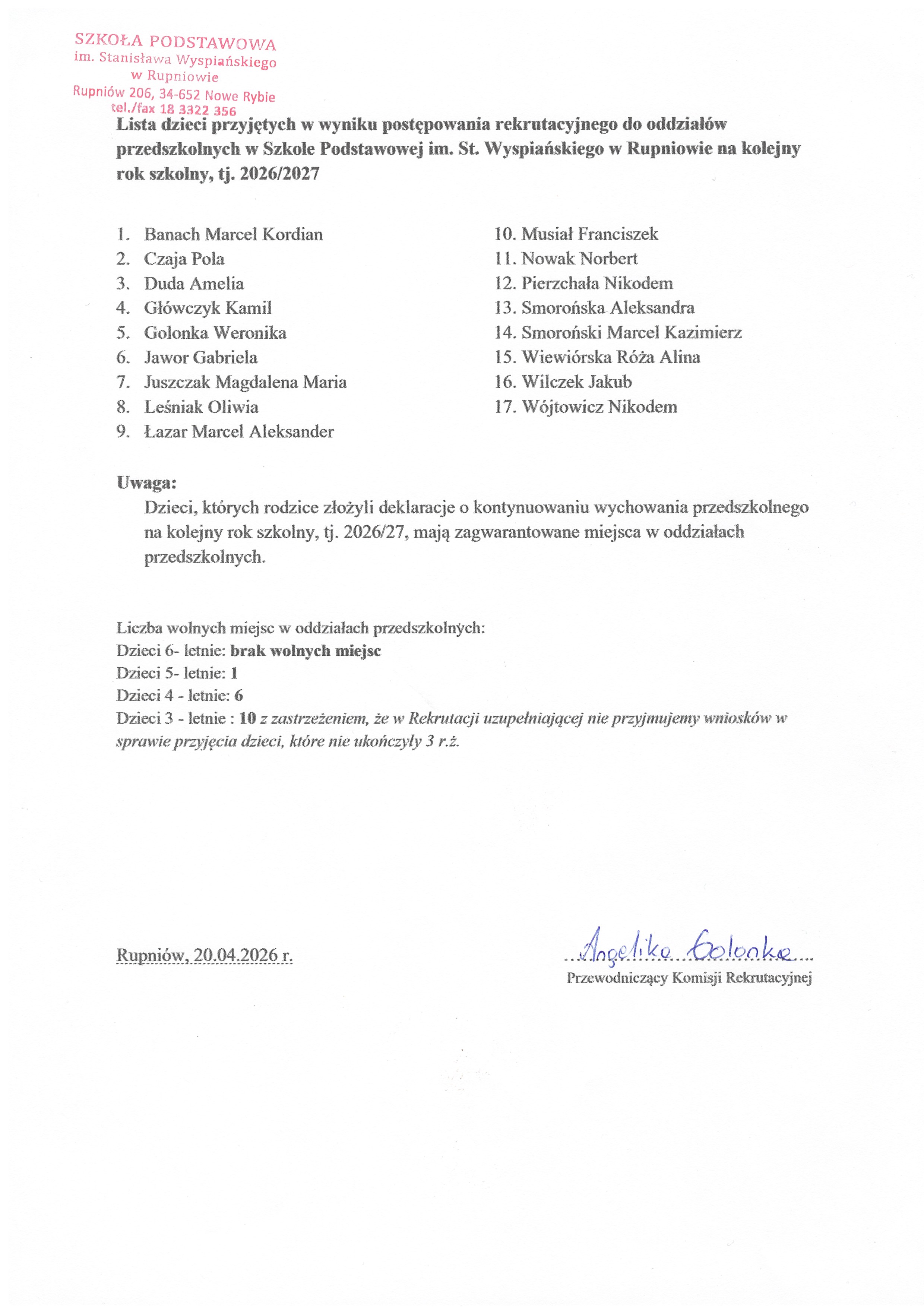 * Rodzice dzieci już uczęszczających- przyjętych do oddziału przedszkolnego w n/szkole w roku szkolnym 2025/26- składają na kolejny rok szkolny jedynie deklarację o kontynuowaniu wychowania przedszkolnego w oddziale przedszkolnym w szkole podstawowej. Termin złożenia deklaracji: do 23 lutego 2026r.