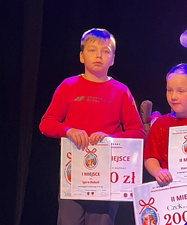 Czworo uczniów z klasy III znalazło się na podium: Igor Bubula uzyskał I miejsce, a Amelia Nowak, Gabriela Kaletka i Antoni Wójtowicz miejsce III. Natomiast Zuzanna Ferenczak otrzymała wyróżnienie. W konkursie brała udział także Zuzanna Dudzic. Laureatom serdecznie gratulujemy i życzymy dalszych artystycznych sukcesów.