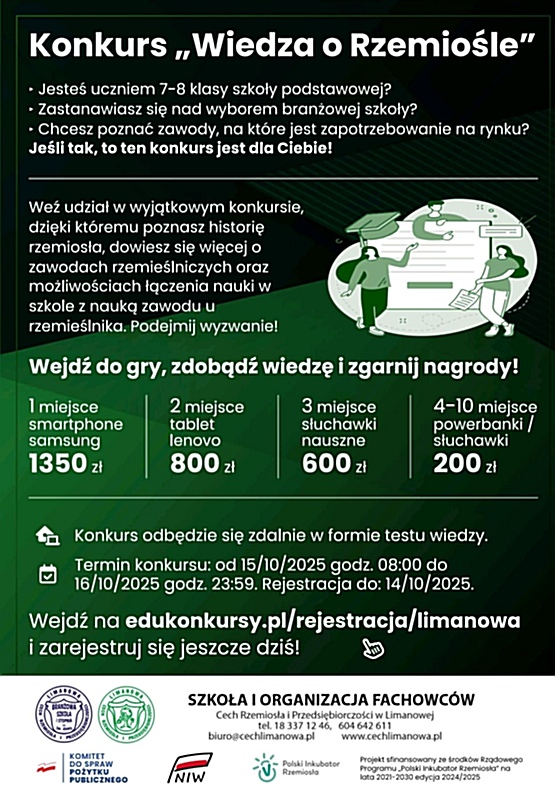 Zapraszamy uczniów klas 7 i 8 do udziału w Konkursie Wiedzy o Rzemiośle 2025.