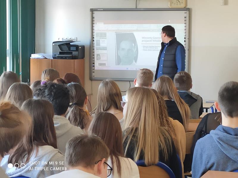Z tej okazji gościem w naszej szkole był Pan Karol Wojtas - lokalny historyk. Pan Karol przedstawił uczniom klas 7-8 interesującą prezentację dotyczącą działalności podziemia antykomunistycznego i niepodległościowego na Ziemi Limanowskiej w czasie i po zakończeniu II wojny światowej. Przedstawił sylwetki wybranych Żołnierzy Wyklętych: generała Augusta Fieldorfa „Nila”, rotmistrza Witolda Pileckiego oraz pochodzących z ziemi limanowskiej- Wincentego Gawrona (jego współpracy w obozie w Auschwitz z rotmistrzem Pileckim), Genowefy Kroczek „Lotte” -„Małopolskiej Inki”, która jako młoda dziewczyna oddała życie za Ojczyznę, Wojciecha Dębskiego „Bicza”, rodziny Bukowców, ks. Ignacego Zonia. Na koniec uczniowie, którzy potrafili odpowiedzieć na pytania otrzymali przewodniki i mapy „Szlaku AK na Ziemi Limanowskiej”