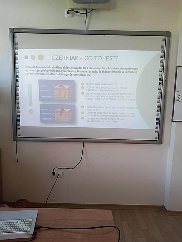 W ramach realizacji programu nauczyciel biologii przeprowadził z uczniami pogadankę o tym groźnym nowotworze skóry - wyjaśnił czym jest czerniak, omówił jego charakterystyczne cechy (tzw. ABCDE czerniaka) oraz złote zasady ochrony przed tym nowotworem. Uczniowie obejrzeli również film, pokazujący jak prawidłowo sprawdzać skórę i uchronić się przed czerniakiem. Pod koniec zajęć uczniowie mieli również możliwość sprawdzenia swojej wiedzę na temat czerniaka rozwiązując krótki quiz.