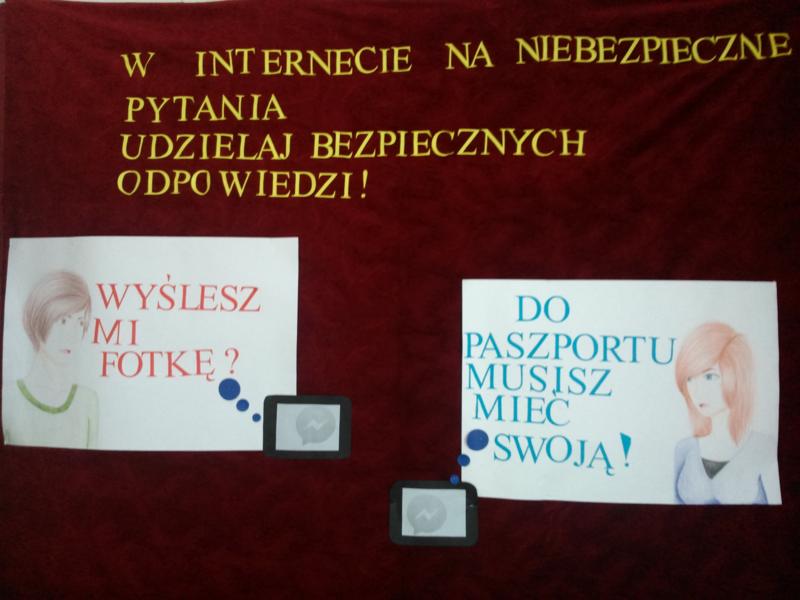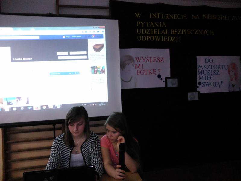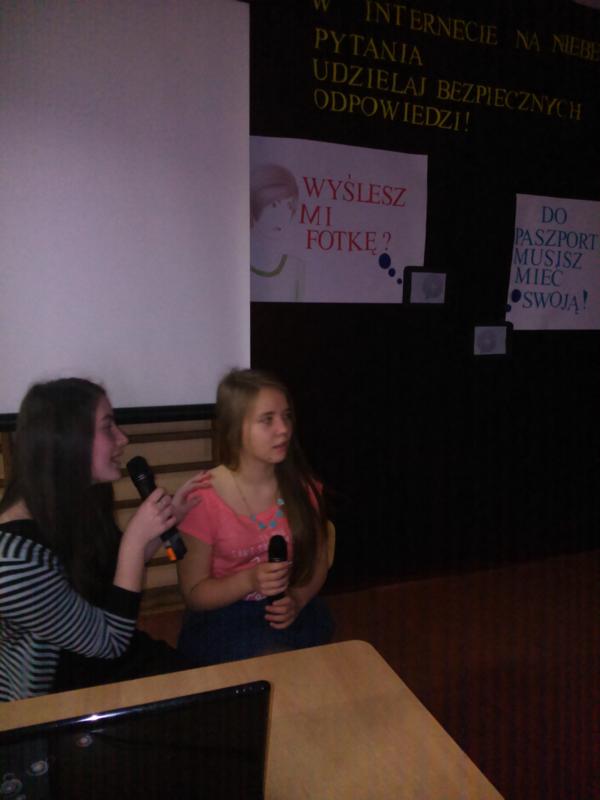 z okazji Dnia Bezpiecznego Internetu, który prowadziły dziewczyny z kl. 2b PG i VI SP pod "czujnym okiem" pani Wioletty Bukowiec. Dziewczyny przedstawiły nam 4 podstawowe zasady bezpiecznego korzystania z Internetu w bardzo ciekawy sposób, a mianowicie przedstawiły 2 skecze i piosenkę na ten temat. Jedna z scen była autorstwa naszej uczennicy Anny Smoter (kl 2 PG). Dziewczyny przedstawiły zagrożenia płynące z nieodpowiedniego korzystania z sieci w badzo obrazowy sposób - nawet pokazały rozmowę na jednym z portali społecznościowych tak, że uczestnik był świadkiem calego zdarzenia. Oczywiście nie zabrakło również wskazówek gdzie szukać pomocy, jak się zachować i jak wyjść z opałów obronną ręką.