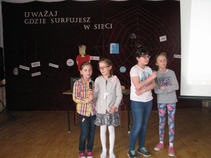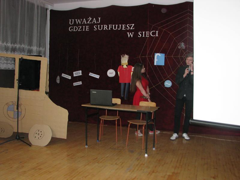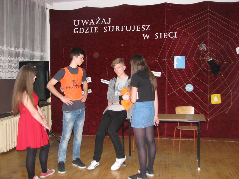 Jedna z inscenizacji odzwierciedlała współczesną kulturę dziecięcą i młodzieżową, obecny styl życia. Zakończenie zawierał morał: Zadbaj o swój wizerunek, szanuj innych w sieci, chroń swoją prywatność. Kolejne skecze ostrzegały przed podawaniem swoich danych osobowych czy też przed korzystaniem bez umiaru z Internetu. Następny epizod przypominał, aby mieć ograniczone zaufanie wobec znajomości zawieranych w sieci. Młodzież pokazała czym jest cyberprzemoc, jakie są jej konsekwencje (zarówno dla ofiar jak i sprawców) oraz jak sobie z nią radzić. Ich występ uatrakcyjniły koleżanki śpiewające piosenki. Pierwszą pt. „Internet” zaśpiewały dziewczynki ze szkoły podstawowej (tekst: https://zapytaj.onet.pl/Category/015,014/2,24177893,Przerobione_teksty_piosenek.html), natomiast autorami tekstu drugiego utworu są uczniowie kl. 3b gimnazjum.