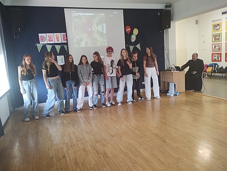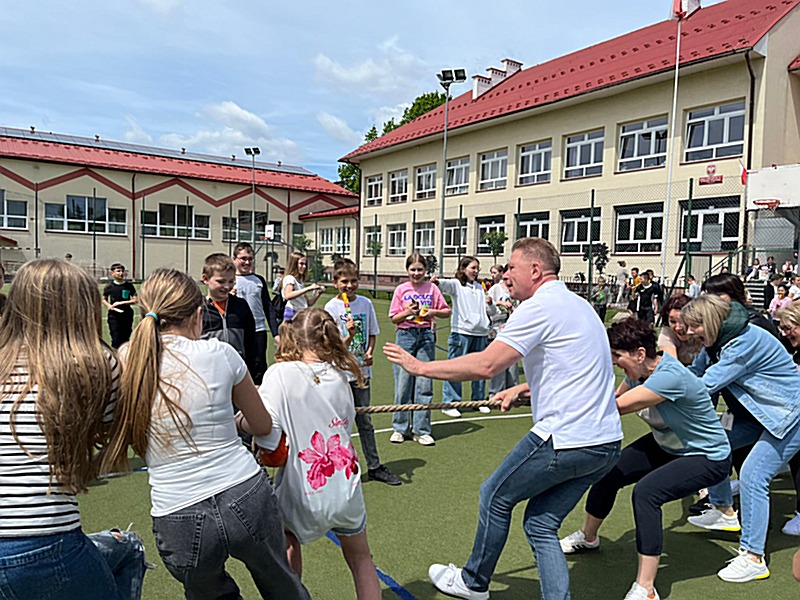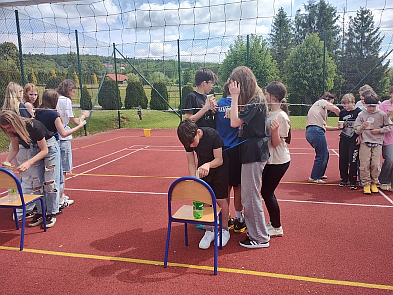 30 maja 2025 roku odbył się w naszej szkole Dzień Dziecka. W tym roku uczniowie klas III - VIII mogli zmierzyć się w następujących kategoriach: karaoke - wykonanie wybranej piosenki, kahoot - quiz wiedzy o szkole, turniej e-sport Fifa, escape room, rozgrywki międzyklasowe w piłkę nożną i siatkówkę, grupowe zawody zręcznościowe np. przelewanie wody, bieg z rzodkiewką na łyżce. Na koniec odbyło się wyczekiwane przez wszystkich przeciąganie liny, w którym zwyciężyły... dziewczyny.
