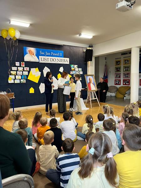 Następnie ksiądz pobłogosławił wszystkich relikwiami Jana Pawła II. Na koniec odśpiewaliśmy „Barkę” i przy jej dźwiękach wysłaliśmy list do nieba przytwierdzony do biało-żółtych balonów. Obserwowaliśmy jak leciał prosto do nieba.💌