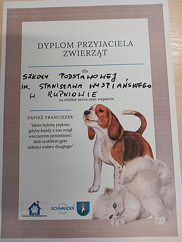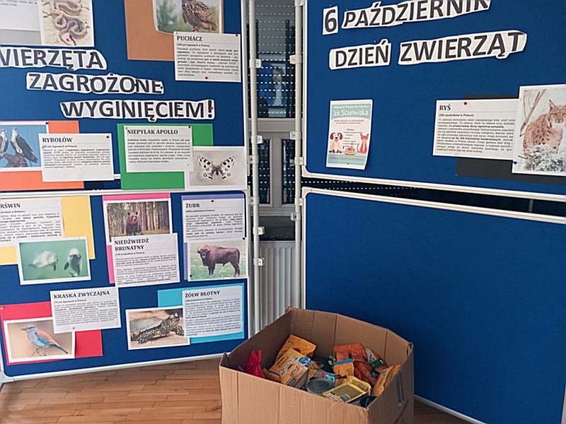 W związku z wspomnianym Dniem Zwierząt w naszej szkole została wykonana gazetka ścienna na temat krajowych zwierząt zagrożonych wyginięciem. Ponadto przez cały październik trwała zbiórka materiałów (jedzenie, zabawki, koce itp.) dla podopiecznych Schroniska w Nowym Sączu pod hasłem „Wspomóż psiaka lub kociaka”. Celem akcji była poprawa standardu pobytu zwierząt w schronisku oraz kształtowanie u dzieci nawyku odpowiedzialności i wrażliwości na los zwierząt.