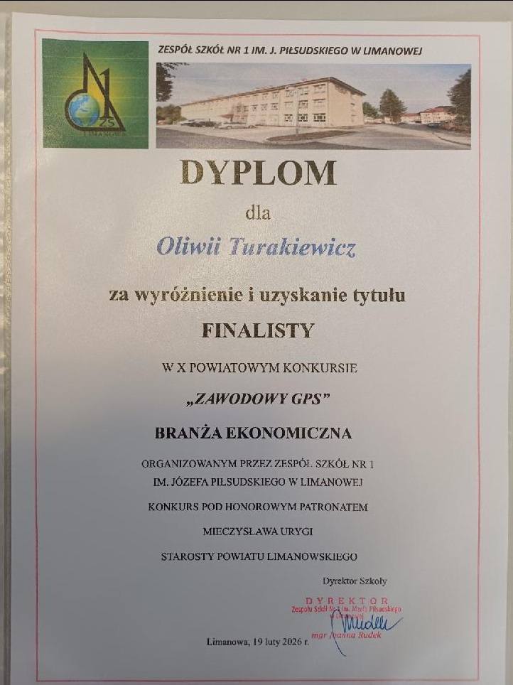 Serdecznie gratulujemy uczennicom klasy VIII: Oliwii Turakiewicz i Gabrieli Opach uzyskania tytułu finalisty w X jubileuszowej edycji, powiatowego konkursu ,,Zawodowy GPS”. Konkurs organizowany jest przez Zespół Szkół nr 1 w Limanowej i ma na celu: wyłanianie, wspieranie i motywowanie uczniów zdolnych w rozwijaniu i poszerzaniu zainteresowań zawodowych, przygotowanie uczniów do świadomego wyboru szkoły ponadpodstawowej, uświadomienie uczniom ich predyspozycji zawodowych, kształtowanie postaw zawodowych uczniów.