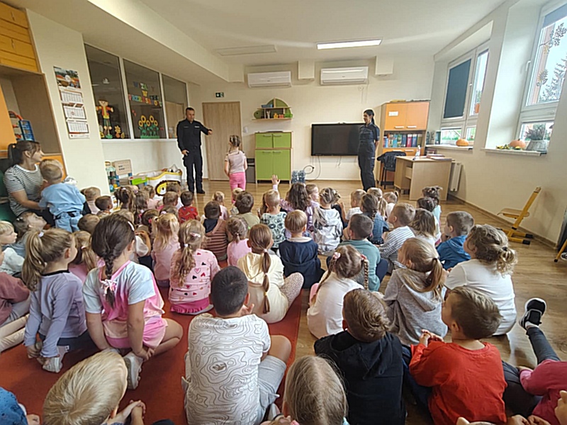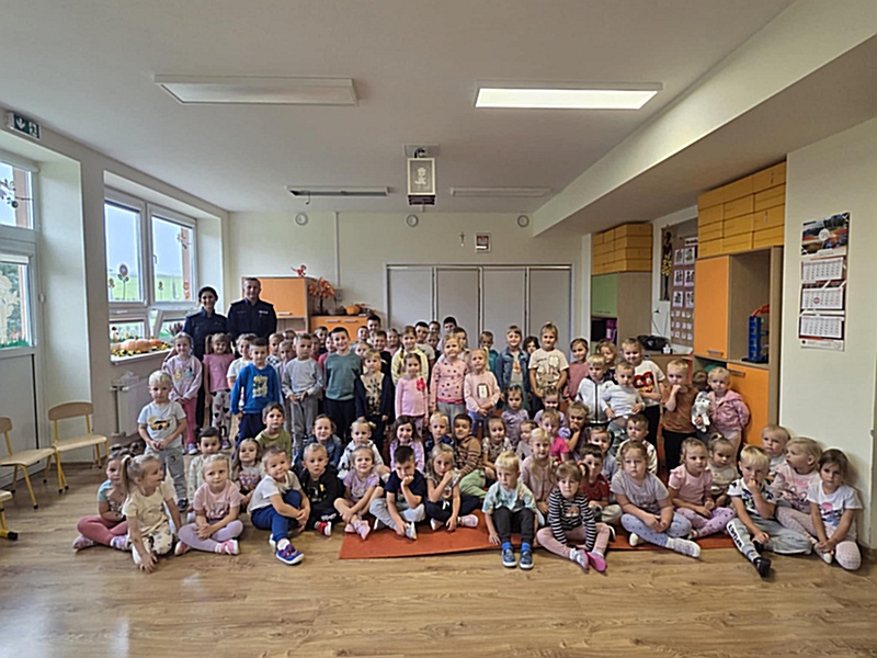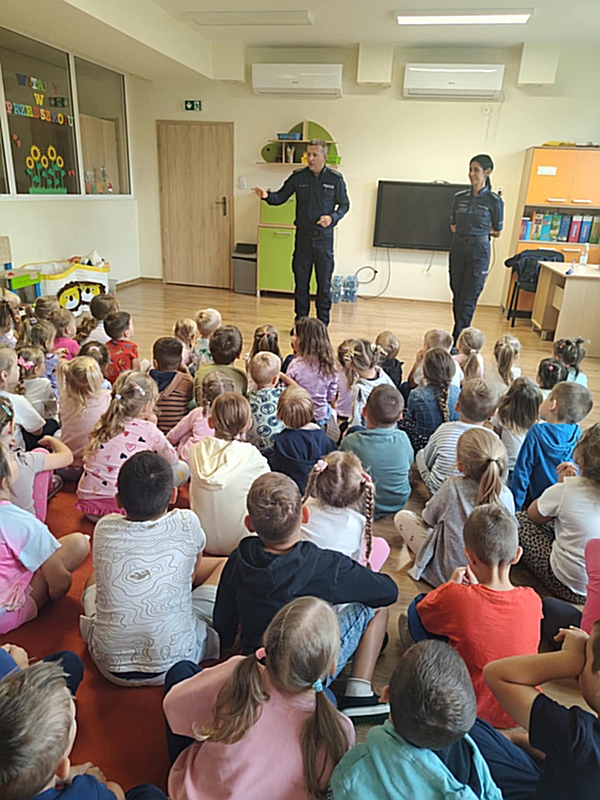 W dniu 17 września 2025 r. dzieci z oddziałów przedszkolnych uczestniczyły w spotkaniu z funkcjonariuszami Policji z Limanowej. Podczas wizyty dzieci miały okazję bezpośrednio poznać pracę policjanta, zakres jego obowiązków oraz dowiedzieć się, w jakich sytuacjach można zwrócić się o pomoc. Funkcjonariusze przybliżyli specyfikę swojej pracy, zaprezentowali elementy umundurowania i wyposażenia, a także omówili znajomość numerów alarmowych oraz procedury wzywania pomocy. Dzieci utrwaliły również zasady bezpiecznego poruszania się po drogach i dowiedziały się, jak właściwie zachowywać się wobec osób nieznajomych. Spotkanie było dla przedszkolaków nie tylko źródłem cennej wiedzy, ale również okazją do praktycznego utrwalenia zasad bezpieczeństwa i rozwijania odpowiedzialnych postaw w codziennym życiu.