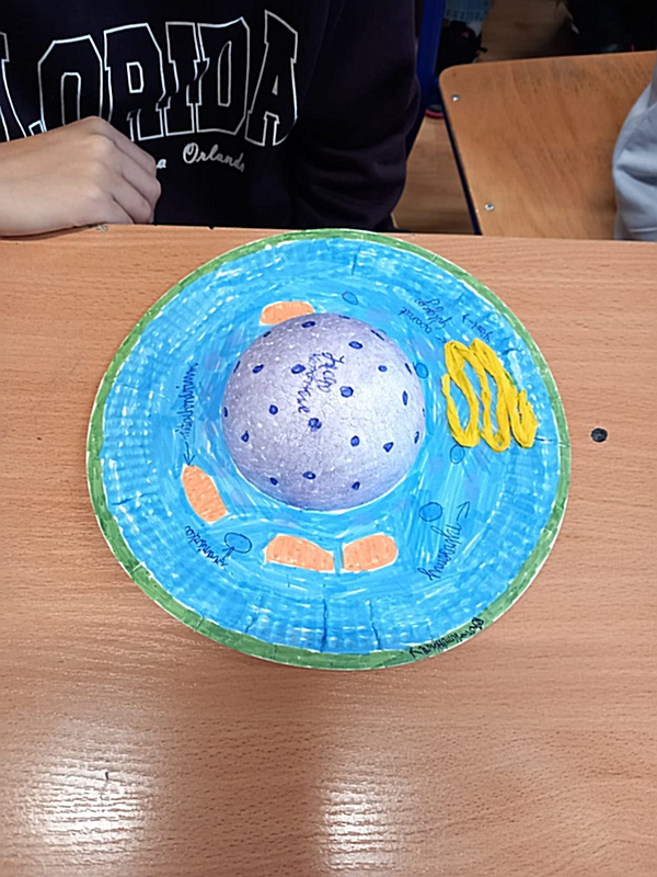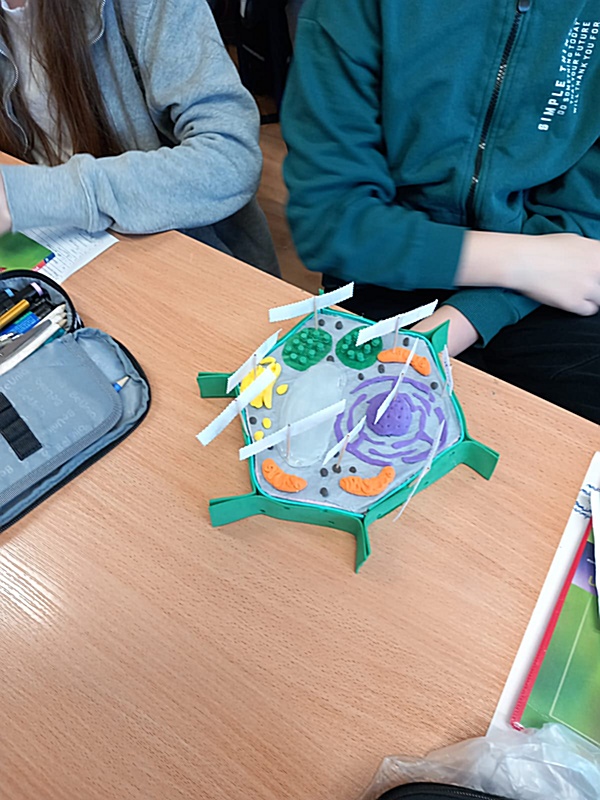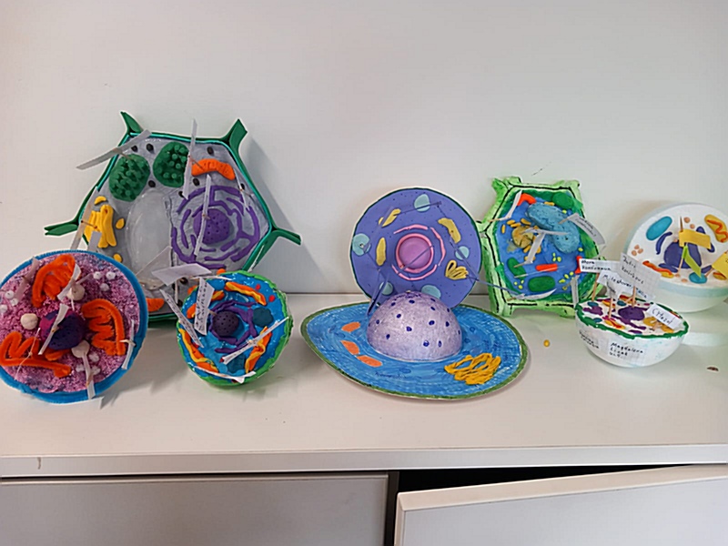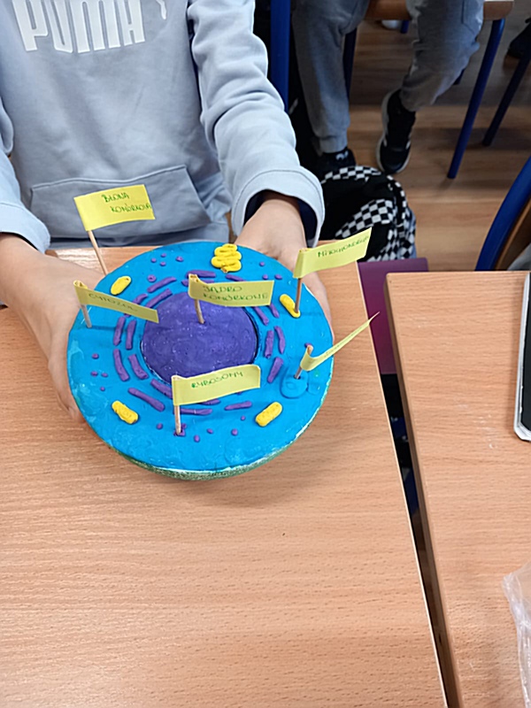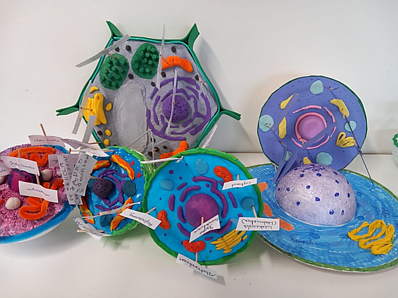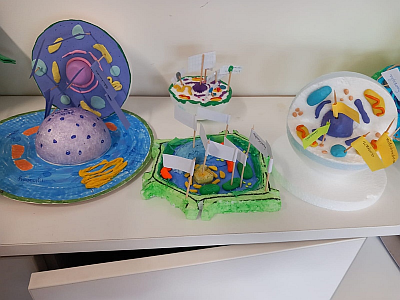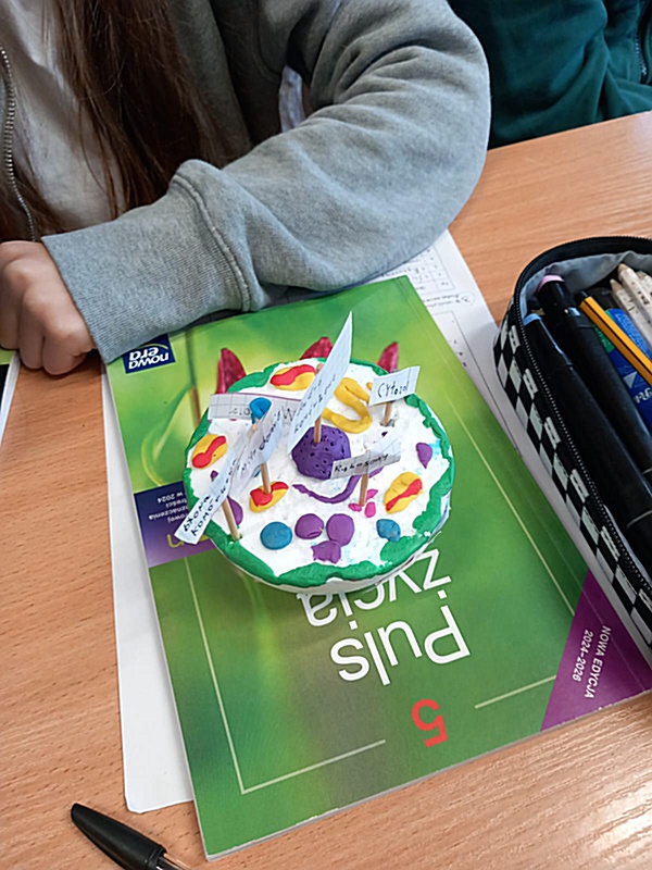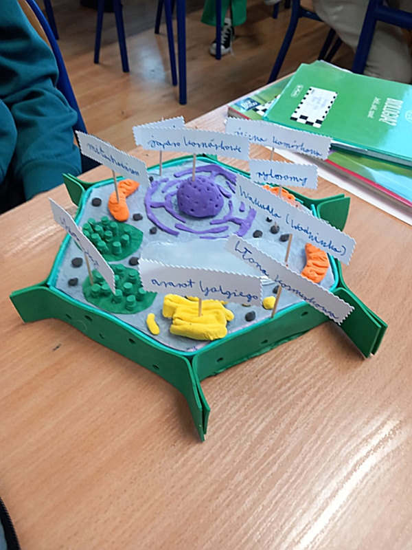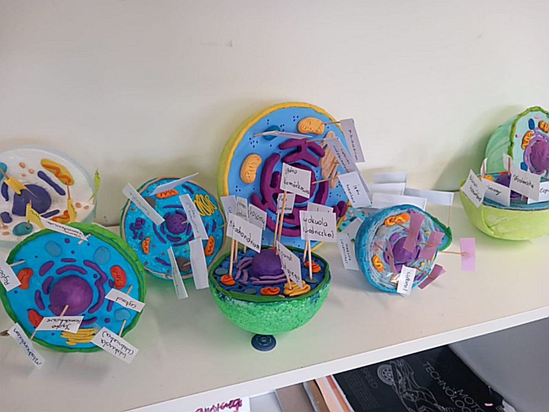 Realizując na zajęciach biologii temat „Komórkowa budowa organizmów” uczniowie klasy 5 wykazali się niezwykłą pomysłowością wykonując modele wybranej komórki. Do ich budowy młodzi biolodzy wykorzystali różnorodne materiały: plastelinę, wykałaczki, kreatywne druciki, gąbkę, tekturowe talerzyki itp. W ten sposób uczniowie podsumowali zdobyte na lekcji wiadomości dotyczące budowy komórki roślinnej, zwierzęcej oraz bakteryjnej, struktur tworzących komórkę – ich wyglądu, funkcji i rozmieszczenia w komórce.