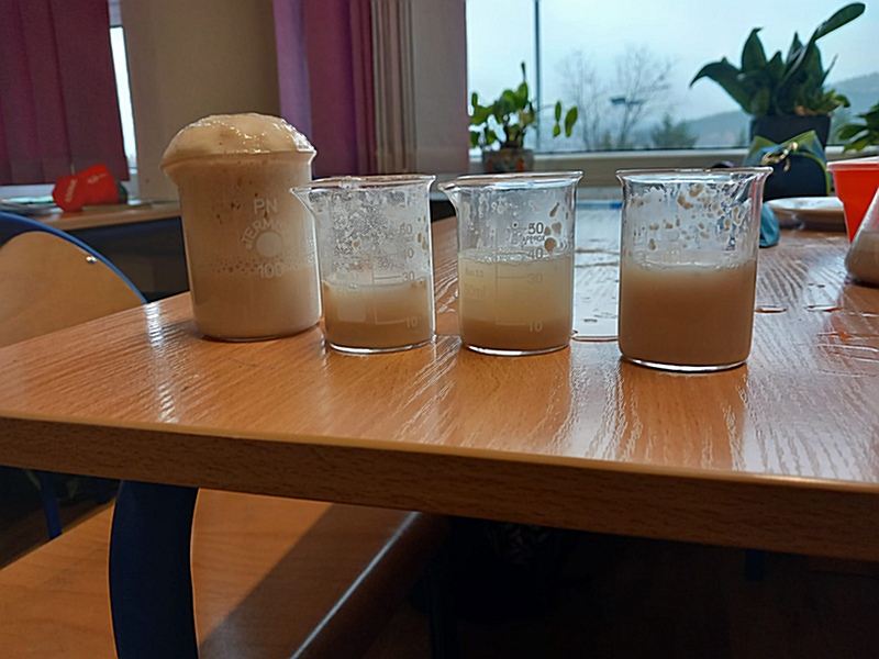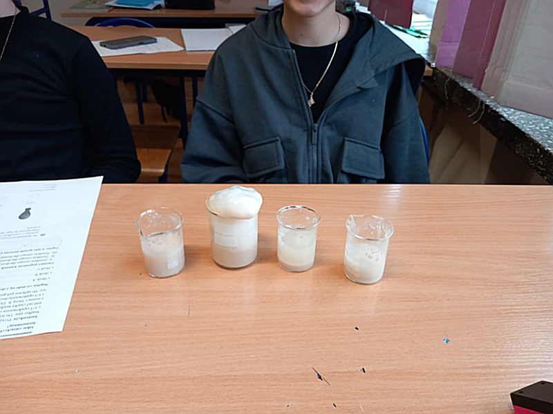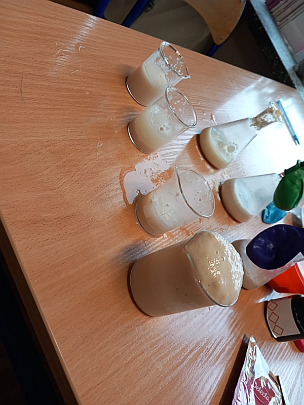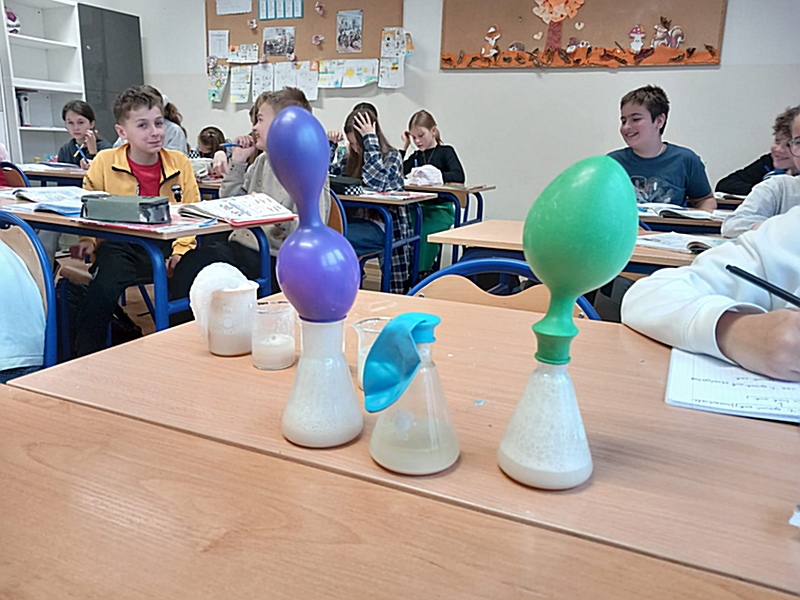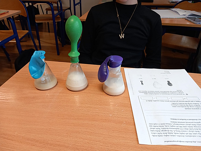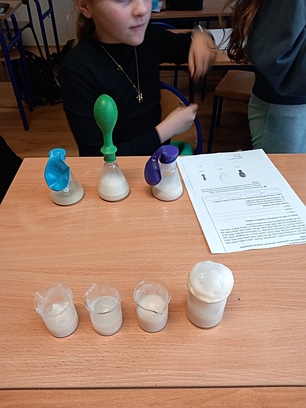 Omawiając zagadnienia związane ze sposobami oddychania organizmów piątoklasiści pod lupę wzięli właśnie drożdże. Wyjaśniając proces fermentacji przeprowadzili doświadczenie, którego celem było ukazanie procesu oddychania beztlenowego, w czasie którego drożdże rozkładają cukry między innymi na dwutlenek węgla. Uczniowie dowiedzieli się, również, że to właśnie dwutlenek węgla sprawia, że ciasto drożdżowe rośnie.