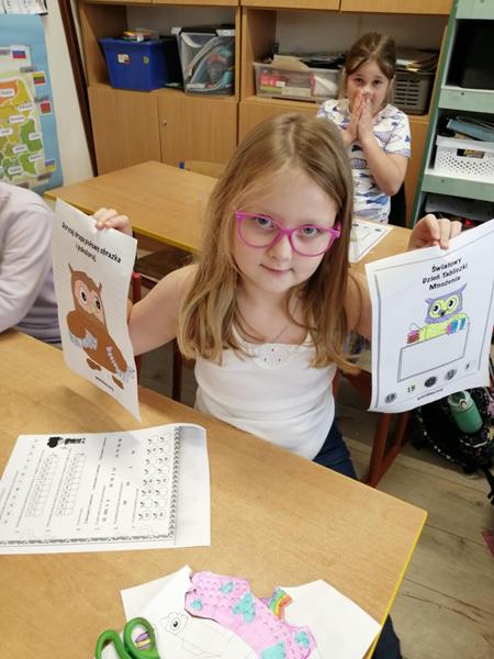 Przedszkolaki kolorowali sowę symbol SDTM, kasy 1 i 2 również w tym dniu bawili się matematyką, rozwiązywali zadania i gry przygotowane specjalnie dla nich.
