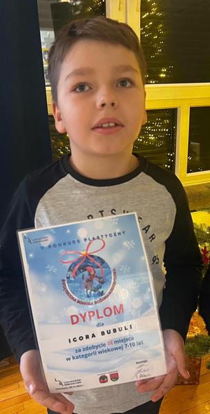 Uczniowie naszej szkoły: Igor Bubula, Julia Dudek, Zuzanna Dudzic, Zuzanna Ferenczak, Gabriela Kaletka, Amelia Nowak, Filip Nowak, Antoni Wójtowicz z klasy II oraz Sergiusz Bubula z klasy VII wzięli udział w V Konkursie plastycznym "Świąteczna Bombka Bożonarodzeniowa" organizowanym przez Limanowski Dom Kultury. W kategorii klas młodszych Igor Bubula zajął III miejsce a Amelia Nowak otrzymała wyróżnienie, w grupie uczniów starszych I miejsce zajął Sergiusz Bubula. Gratulujemy i życzymy dalszych sukcesów artystycznych.