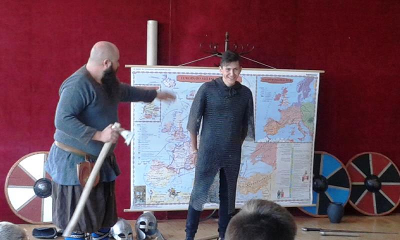 Żywa lekcja historii – wiedza i zabawa. „Wojownicy – kupcy - podróżnicy” – Wikingowie – takie zajęcia odbyły się w dn. 14 maja w naszej szkole. Uczniowie szkoły podstawowej i gimnazjum mogli przenieść się do czasów z okresu ekspansji Wikingów – Normanów – ludzi północy. Poznali elementy mitologii skandynawskiej, kultury i obyczajów. W czasie pokazu obserwowali walki wojów oraz brali udział w krótkich scenkach historycznych. Mogli na żywo zetknąć się z replikami zbroi, kolczug, hełmów, tarcz i toporów. Wzięli udział w konkursie wiedzy o Wikingach, a nagrodą były magiczne kamienie runiczne. Była świetna zabawa i dużo emocji, zwłaszcza dla najmłodszych uczniów.