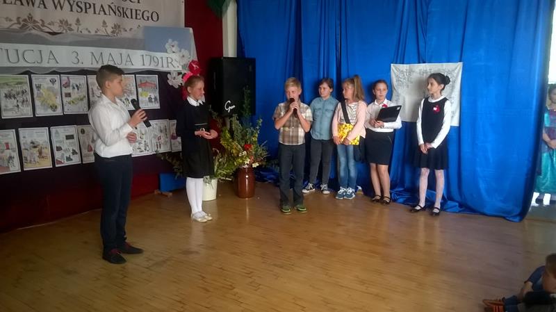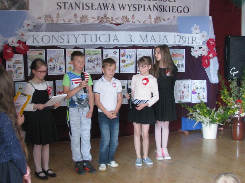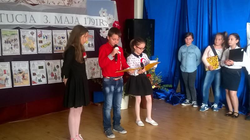 Uczniowie klas III a i b zaprezentowali uczniom klas 0 – III przygotowaną z okazji Święta Konstytucji 3 Maja część artystyczną pt. „Witaj majowa jutrzenko”. Mali aktorzy z klas III recytowali wiersze i śpiewali piosenki tematycznie związane z obchodzonym świętem. Występ uatrakcyjniły epokowe stroje, w które byli ubrani uczniowie wcielający się historyczne postacie. W ciekawy sposób przybliżyli młodszym kolegom i koleżankom problematykę czasów rozbiorów, Sejmu Czteroletniego oraz to jak ważna była i jest konstytucja dla obywateli i demokracji.