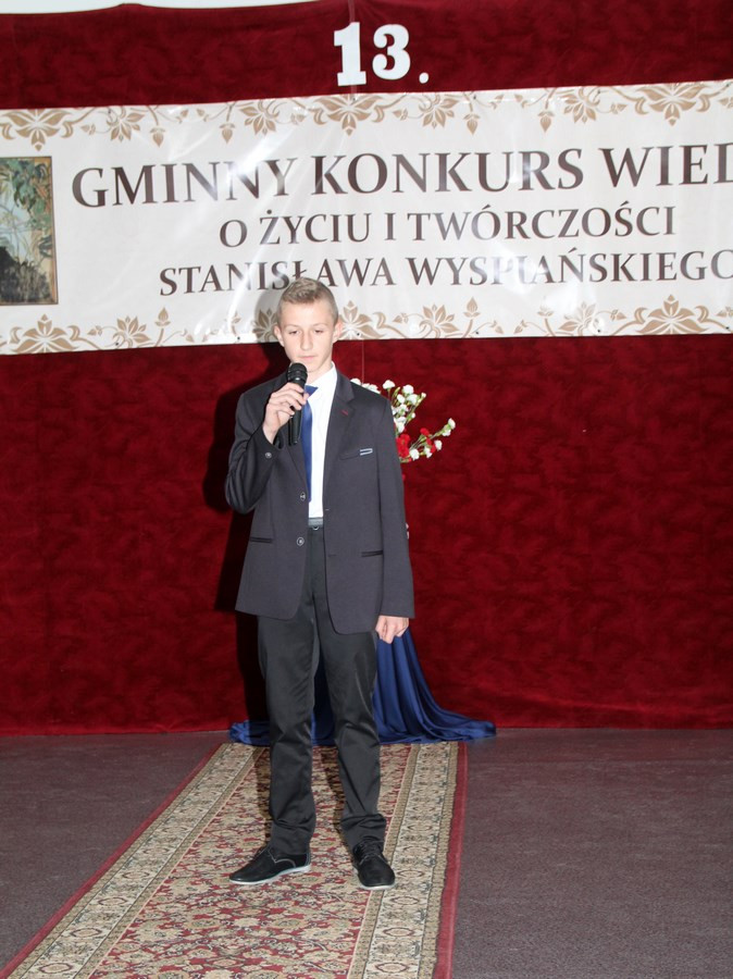 Wzruszające przemówienie zamykało najważniejszą część uroczystości, jednak nie stanowiło jej końca. Kolejnym miłym akcentem była część artystyczna przygotowana przez Samorząd Uczniowski pod opieką pań Urszuli Pałki i Wioletty Bukowiec. Prowadzące przeczytały fragmenty prac uczniów naszej szkoły, którzy wzięli udział w Konkursie o Złote Pióro Dyrektora Szkoły. Ciewawym fragmentem tej części była projekcja filmu wyreżyserowanego przez Kamila Folwarskiego. Prezentacja zabrała nas na wirtualną wędrówkę po szkole. Zgromadzeni mogli podziwiać nauczycieli oraz uczniów podczas codziennej nauki i pracy. W projekcji nie zabrakło również miejsca na wspomnienia. Uczniowie w swoim filmie pochwalili się osiągnięciami oraz przedstawili relację z wydarzeń i konkursów, które miały miejsce w Szkole Podstawowej im. Stanisława Wyspiańskiego w ostatnich kilkunastu latach. Ten uroczysty dzień uświetnili również pięknym śpiewem i recytacją wierszy patrona szkoły.