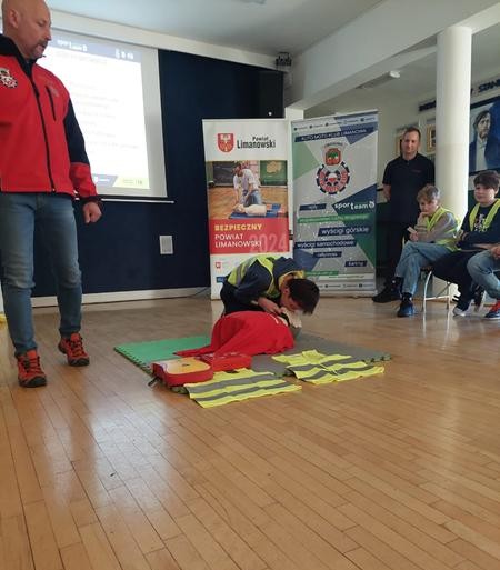 Uczniowie klas V, VI i VII zapoznali się z podstawowymi zasadami postępowania w przypadku zagrożenia zdrowia lub życia. Uczniowie przećwiczyli właściwe zachowania w trudnej sytuacji, wykonywali resuscytację krążeniowo-oddechową na fantomach, dowiedzieli się jak działa defibrylator AED, który jest dostępny w miejscach publicznych. Otrzymali kamizelki i odblaski, mające na celu zwiększenie bezpieczeństwa dzieci i młodzieży na drogach.