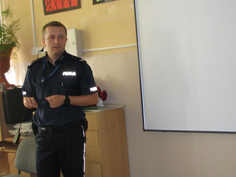 St. sierż. Dariusz Ciba (Wydział Prewencji, Zespół Prewencji Kryminalnej Nieletnich i Patologii) przedstawił problematykę uzależnień wśród młodzieży. Wspomniał o agresji rówieśniczej wynikającej z fascynacji grami. Poszerzył naszą wiedzę o informacje o cyberprzemocy i zagrożeniach z niej wynikających, jakie są jej konsekwencje (zarówno dla ofiar jak i sprawców) oraz jak sobie z nią radzić. Przypomniał zasady bezpiecznego korzystania z Internetu oraz uświadomił uczestników spotkania o odpowiedzialności karnej. Uczniowie z zainteresowaniem i uwagą słuchali rad i wskazówek funkcjonariusza. Spotkanie zaowocowało zgłębieniem wiedzy o zasadach bezpieczneństwa w sieci.