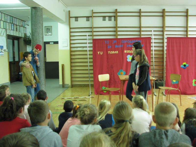 Każdy z nas ma styczność z przejawami agresji w szkole. Dlatego też 5 października br. oglądaliśmy przedstawienie teatralne pt. "Agresja". Głównym celem kilku przedstawionych scenek było ukazanie różnego rodzaju agresji: słownej, psychicznej, fizycznej oraz cyber przemocy. Uczniowie, podejmując dyskusję na temat danej agresji, określali w jaki sposób mogą zapobiec na co dzień agresywnemu zachowaniu uczniów. Podobała się nam gra aktorów. Widać było, że mieli wszystko perfekcyjnie przygotowane i dopięte na ostatni guzik.